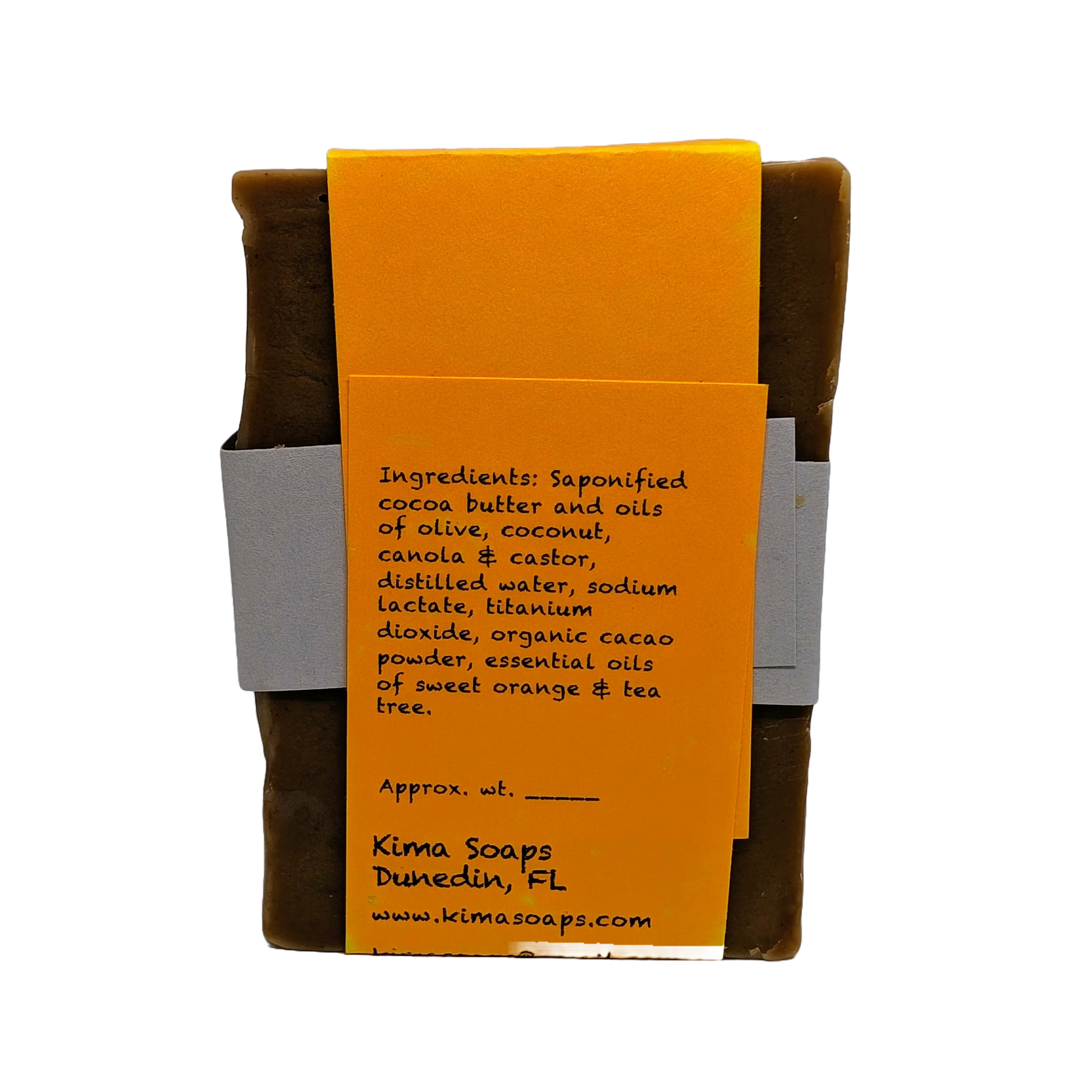 Ingredients: Saponified cocoa butter and oils of coconut, canola, olive & castor; distilled water, sodium lactate (a natural salt), organic cacao powder, titanium dioxide, essential oils of sweet orange & tea tree.
